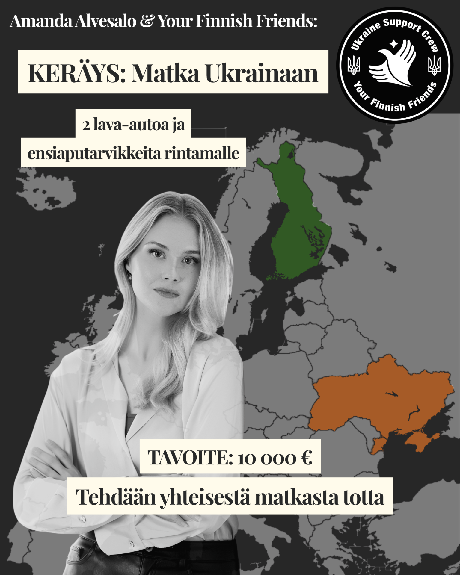A: Keräyksen avulla saamme Ukrainaan juuri sitä apua, jota siellä tällä hetkellä tarvitaan. Haluan myös tarjota lahjoittajille mahdollisuuden nähdä konkreettisesti, mitä lahjoituksilla saadaan aikaan. Dokumentoin matkan ja kerron avoimesti sen vaiheista, joten lahjoittajille syntyy läpinäkyvä kuva keräyksen vaikutuksista.
